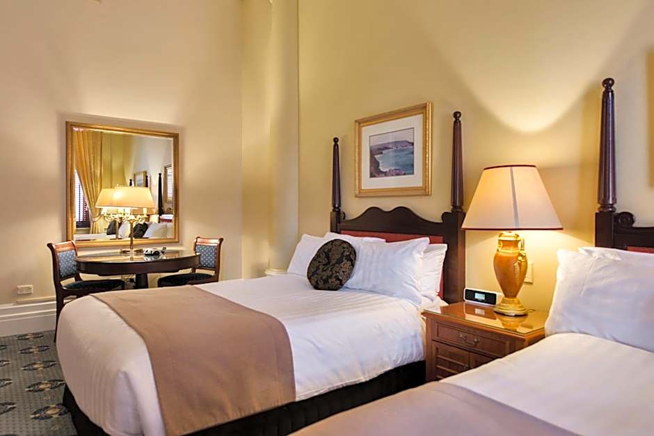 Luxury room with LCD TV, executive work desk, 18-foot high ceilings and a marble bathroom.